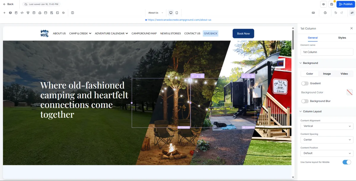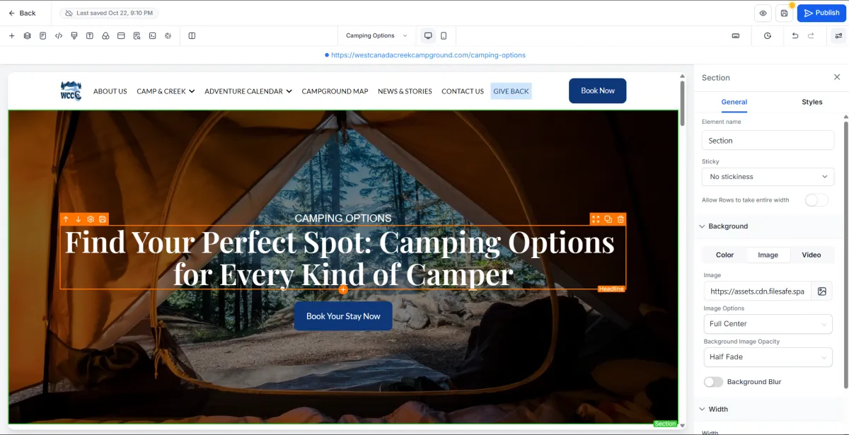 Using larger imagery and better layouts to showcase the natural beauty of the campground and help visitors imagine their stay.